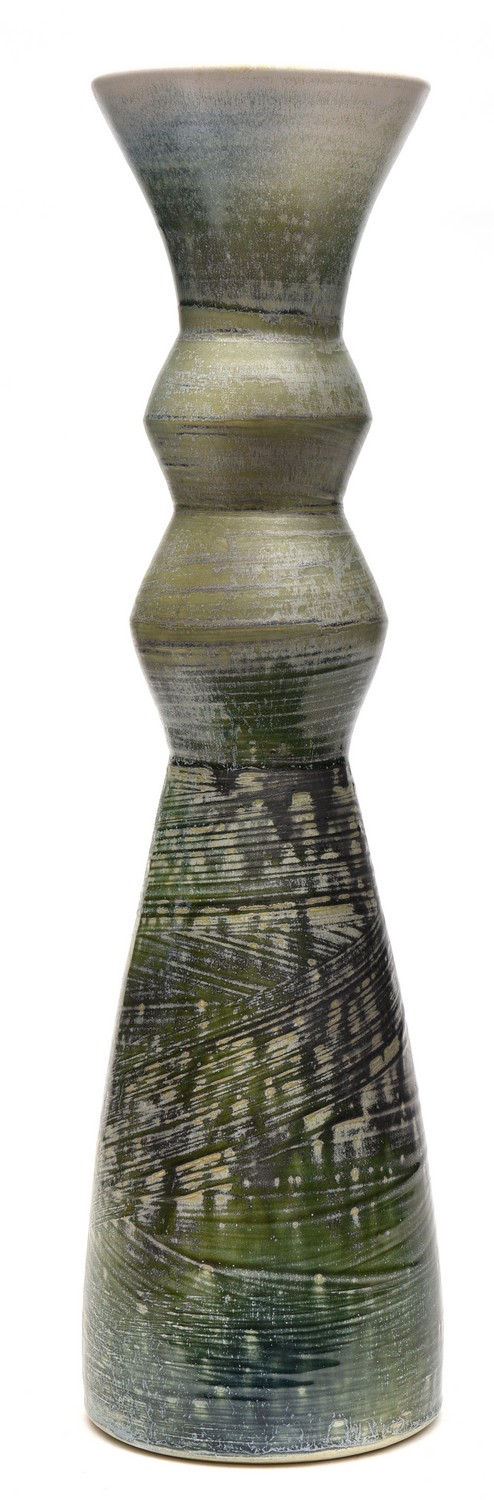 A KEVIN BOYD TALL FLUTED VASE IN GREEN TONES - 52.8 CM HIGH
