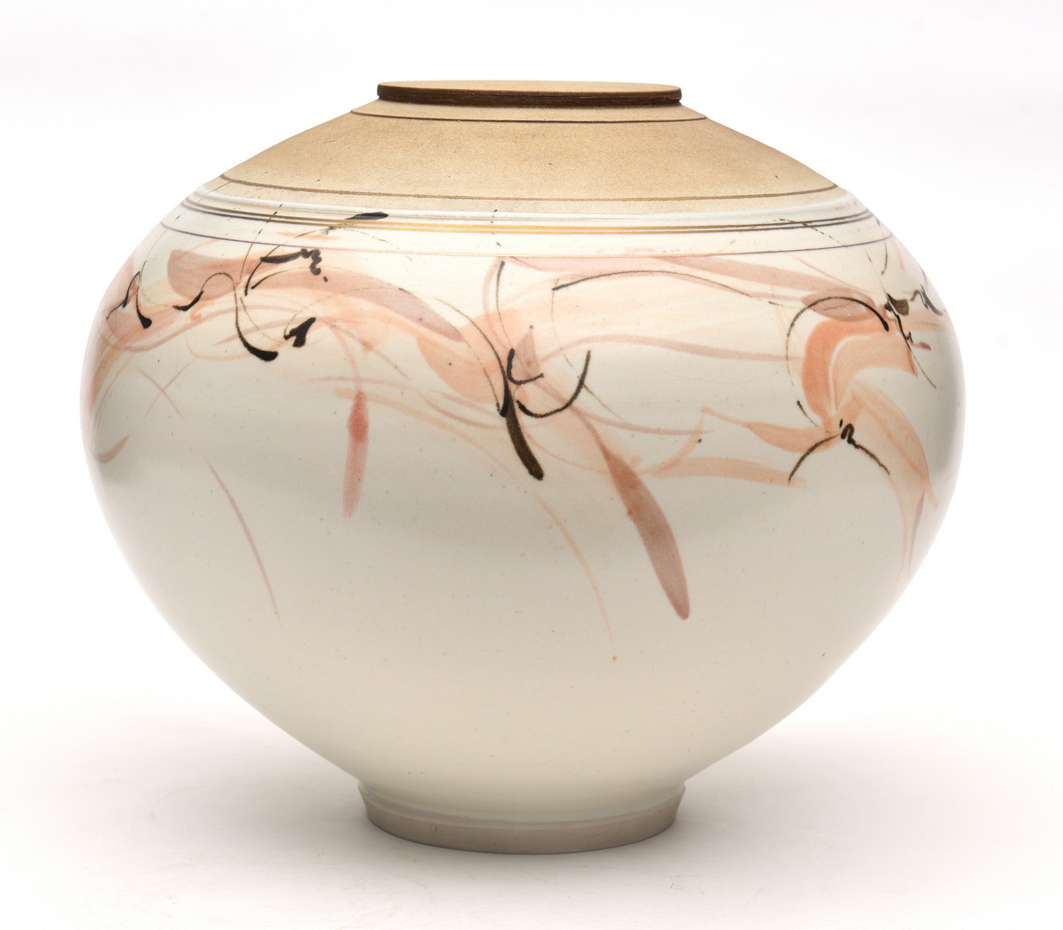 A VIC GREENAWAY 1980S LARGE BALUSTER VESSEL IN CREAM GROUND WITH APPLIED ABTRACT DESIGN, 32H X 36W - 30.9 X 37.4 CM