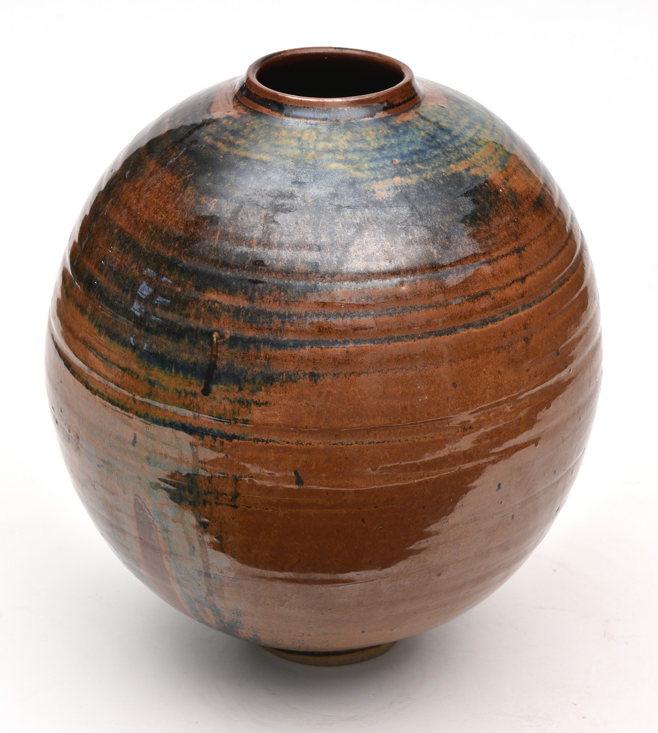 A GREG DALY EARTHENWARE POT IN BROWN/BLACK - 34.6 X 28.3 CM