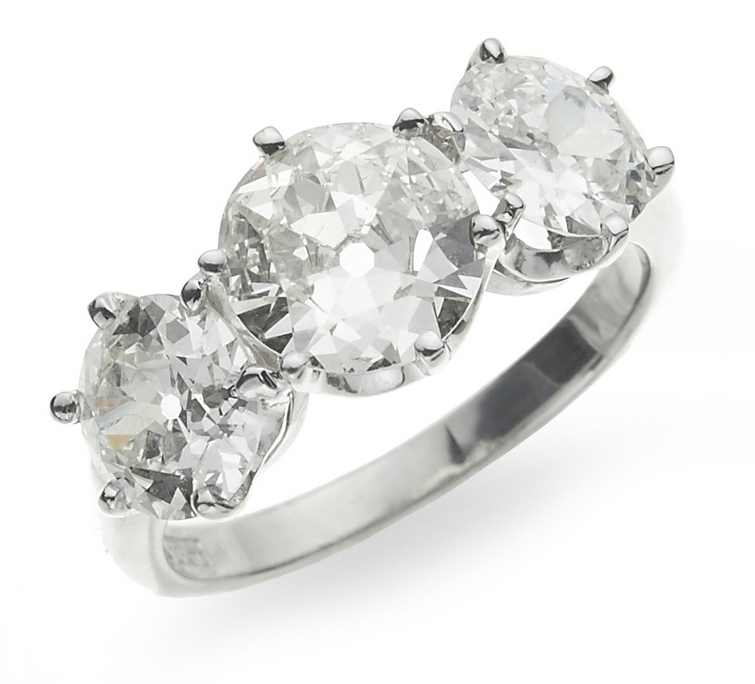 Centrally set with a round old style vintage cut diamond weighing 1.31cts, flanked by round old style vintage cut diamonds totalling 1.86cts, in 18ct white gold, ring size M.