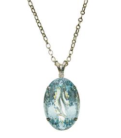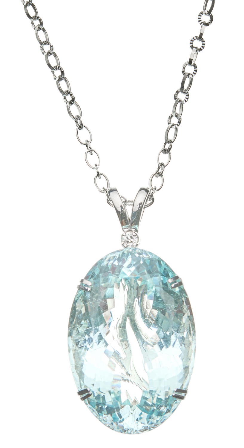 Centrally set with an oval cut aquamarine weighing 98.29cts, in 18ct white gold, with chain.
