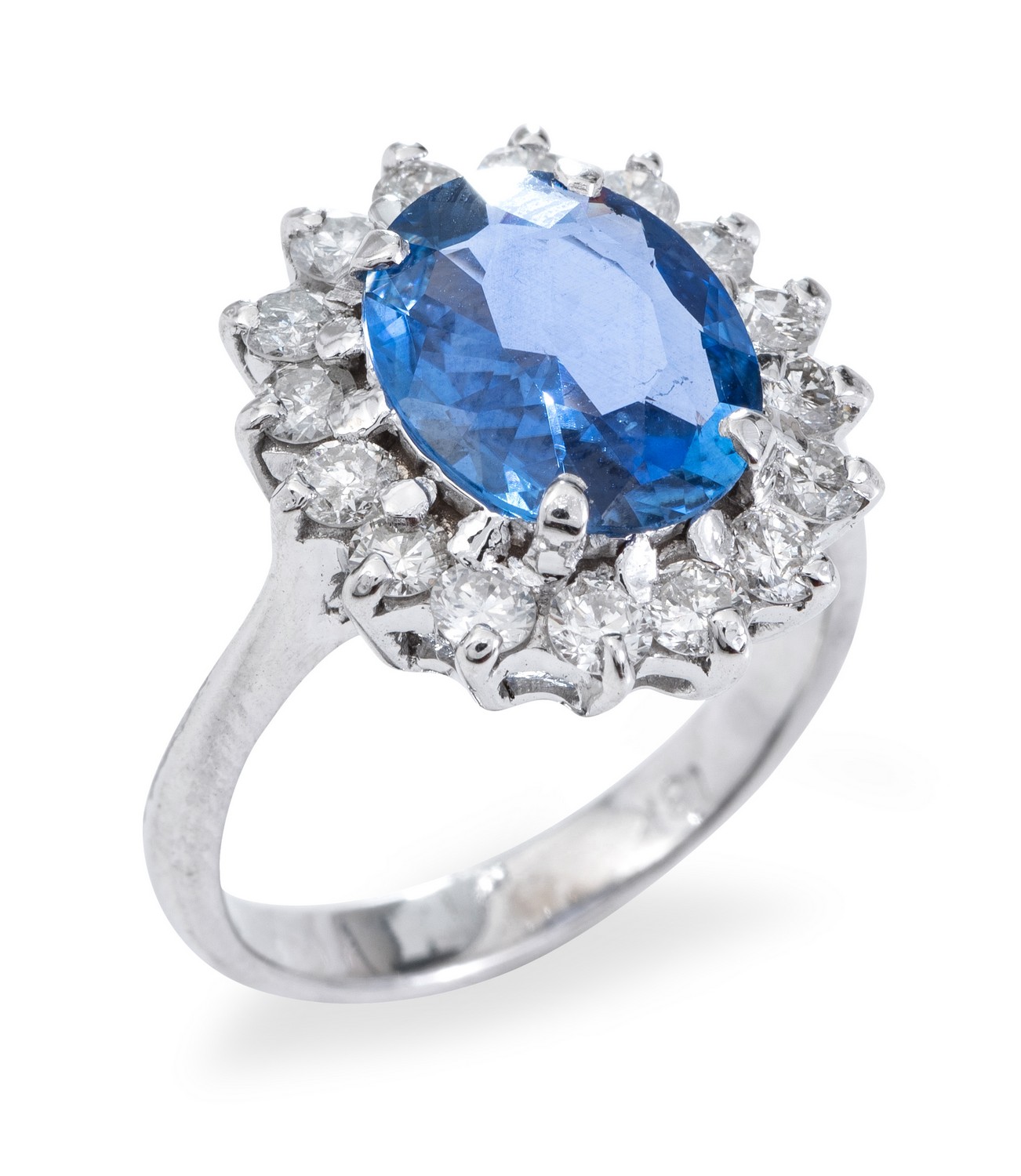 Centrally set with an oval cut blue sapphire weighing 3.0cts, surrounded by round brilliant cut diamonds totalling 1.28cts, in 18ct white gold, ring size M.