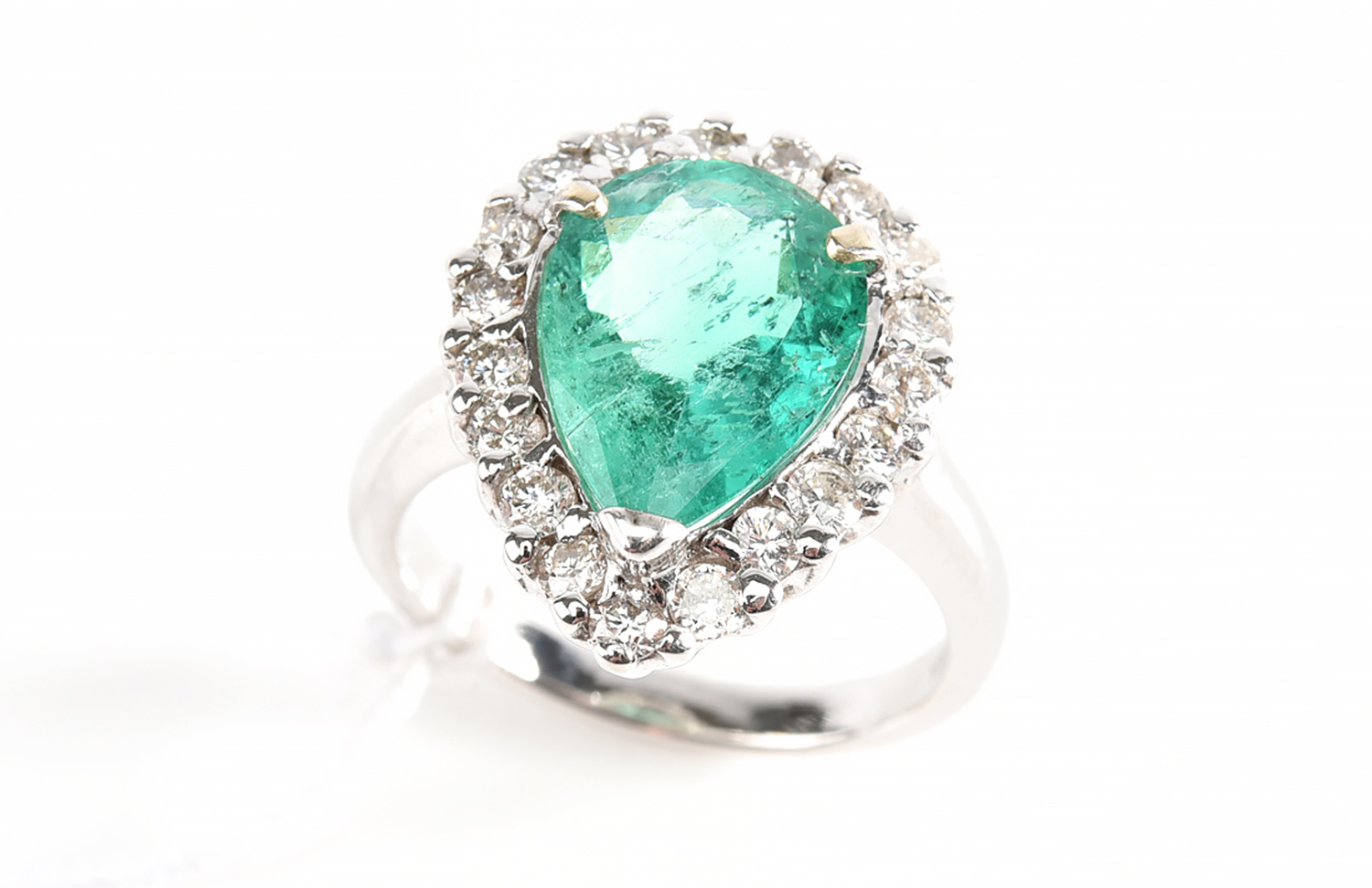 Featuring a pear cut emerald weighing 3.30cts, surrounded by round brilliant cut diamonds totalling 1.10cts, in 18ct white gold, ring size L.
