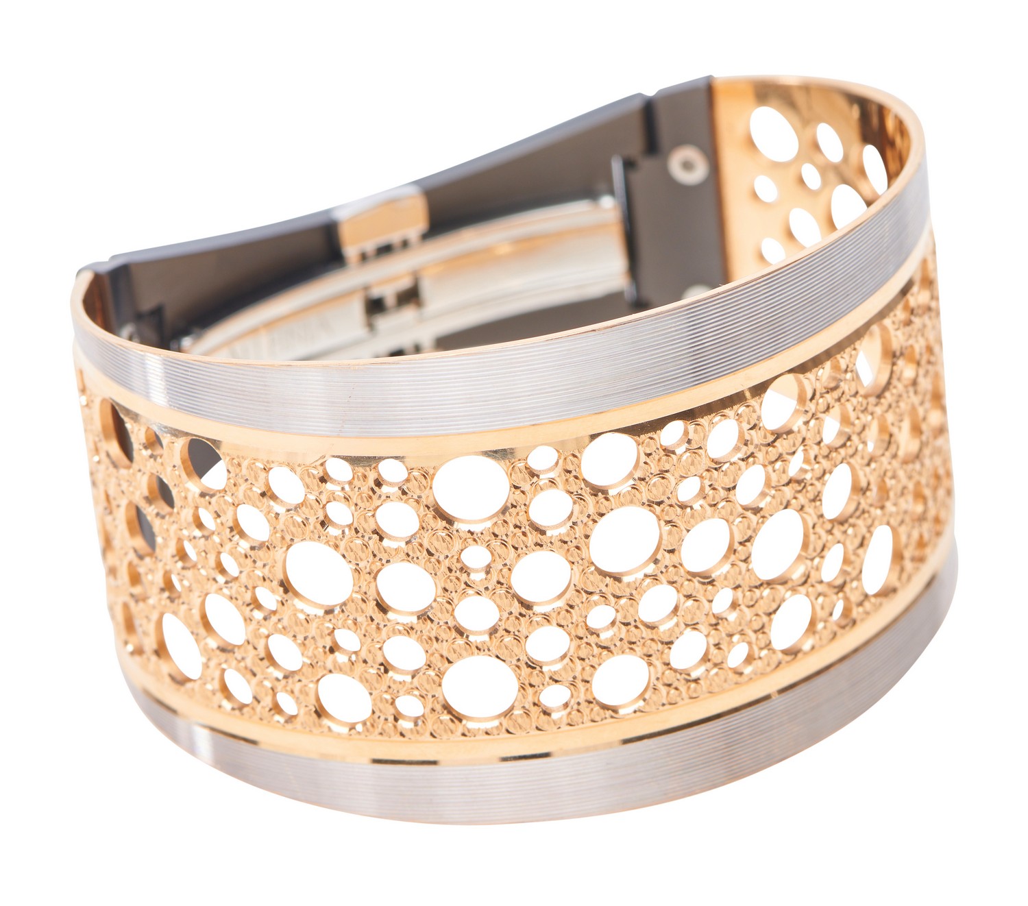 The graduated cuff with textured pierced circular decoration in 18ct rose gold, with ribbed white gold border and titanium deployment style clasp.