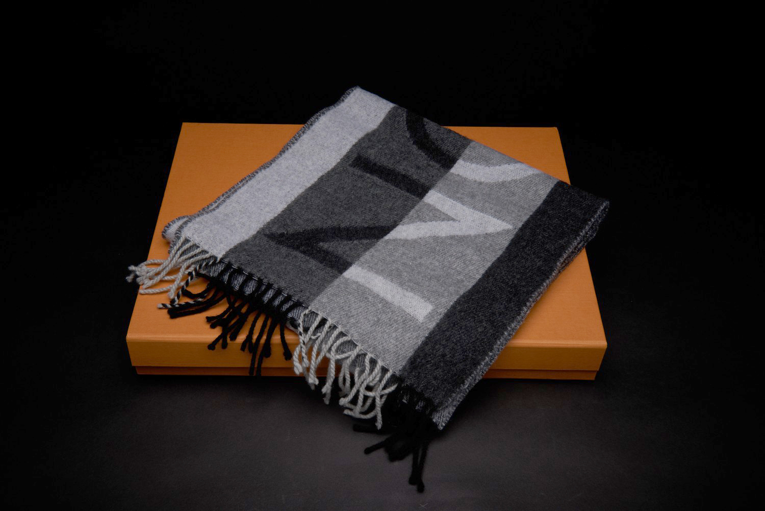 Styled in grey cashmere blend stripe, 168 x 30cm, boxed.