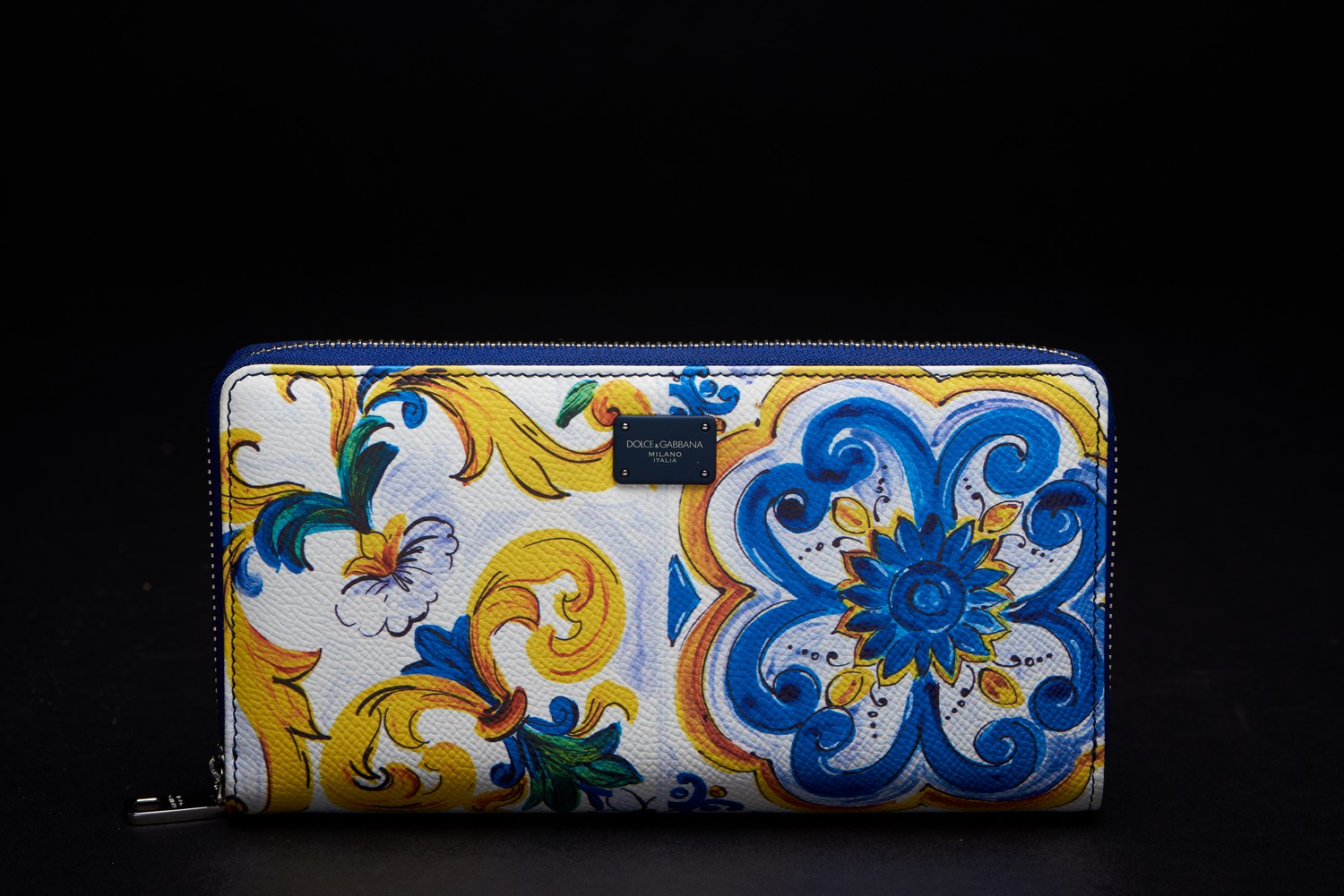 Styled in majolica floral leather with silver metal hardware, 19 x 10 x 2cm, boxed.
