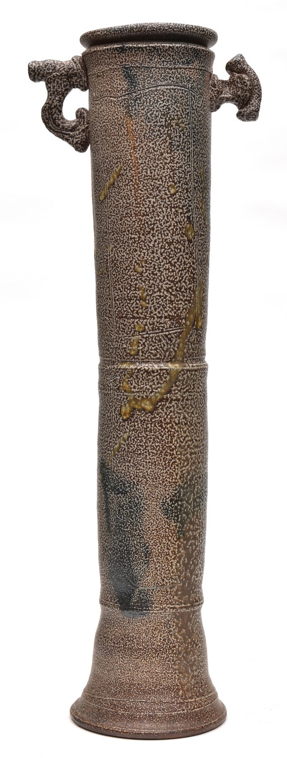 A KERRY SELWOOD WOOD FIRED LARGE CYLINIDRICAL POT 60 CM HIGH 1982 (THE POTTERS GALLERY BRISBANE)