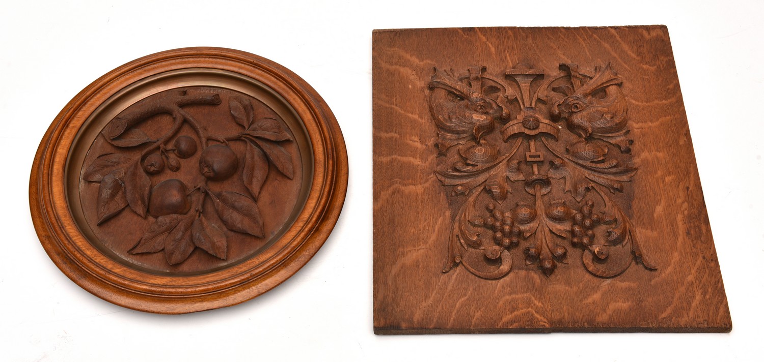 TWO CARVED PANELS BY KENNETH MONROE TIMBER MERCHANT AND WOOD CARVER. ONE FRAMED CIRCULAR WITH APPLE TREE AND ONE FLAT PANEL.