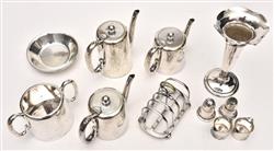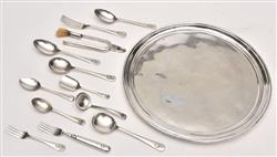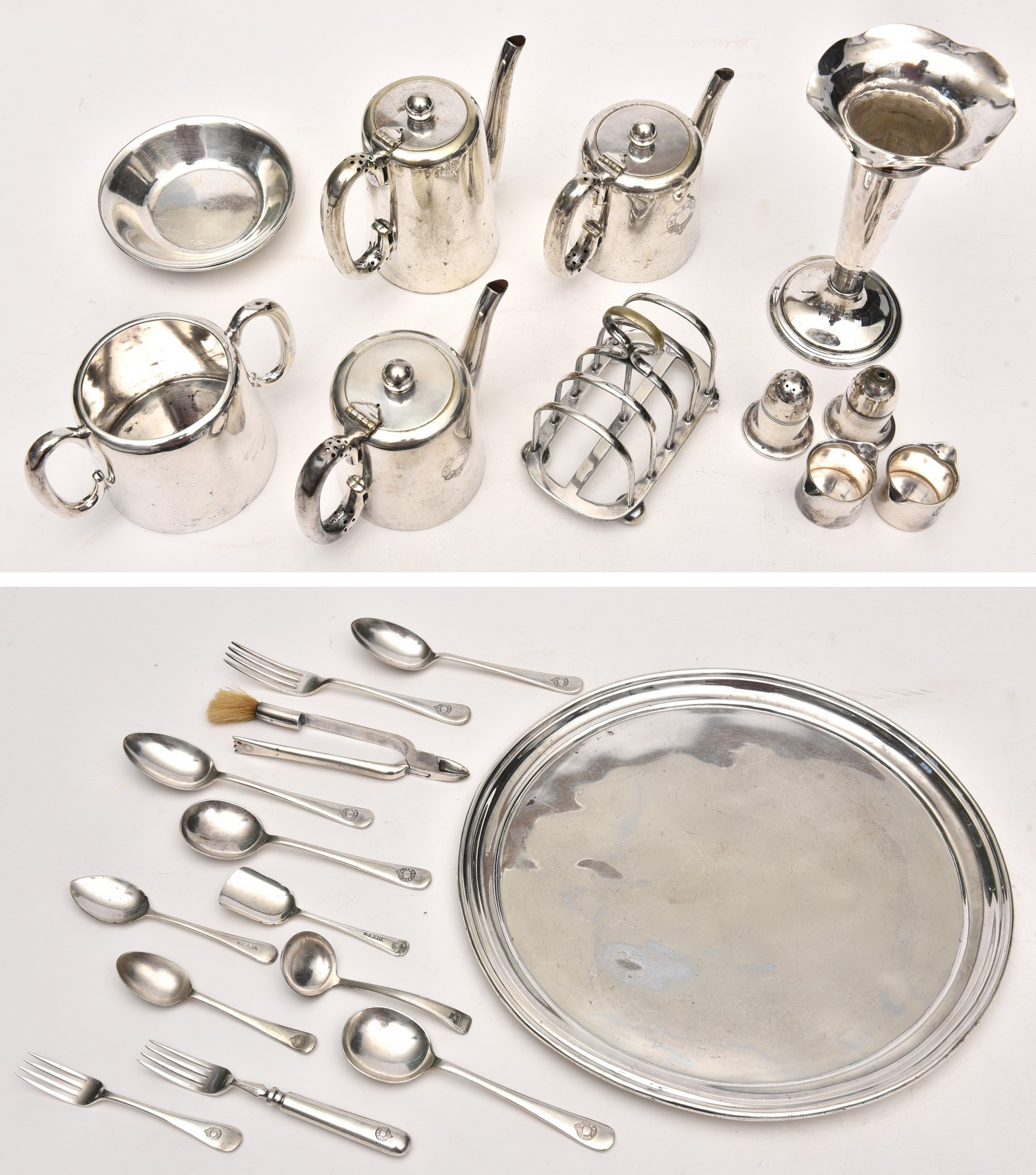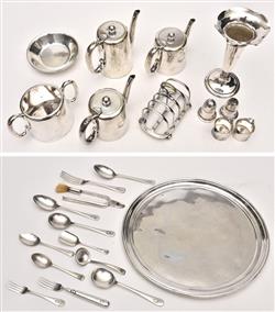 Comprising one badged egg cup, two creamers, pepper and salt shakers, sugar spoon, jam spoon, sauce spoon, six cake forks, a bottle opener, a fish fork, three dinner forks, two dessert spoons, two soup spoons, a toast rack, three lidded pots, a sugar bowl, a tall vase, a large silver tray, sugar tongs, a large tray, a champagne bucket,