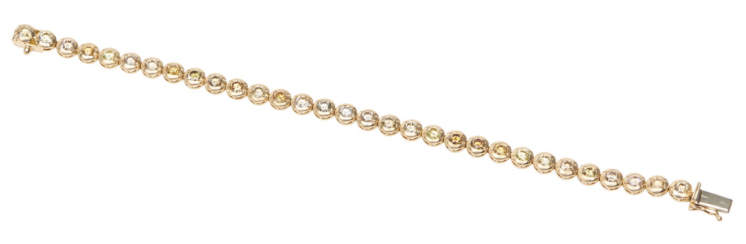 The bracelet presents in very good condition. All diamonds are in very good order and securely set. Diamonds range in colour - yellow, cognac, yellow-green, yellow-orange.