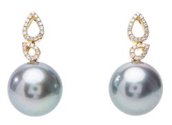 Each earring comprising a round pearl of grey and green hues, measuring 14.0mm, suspended below diamond set open drop shaped surmounts, in 18ct gold.