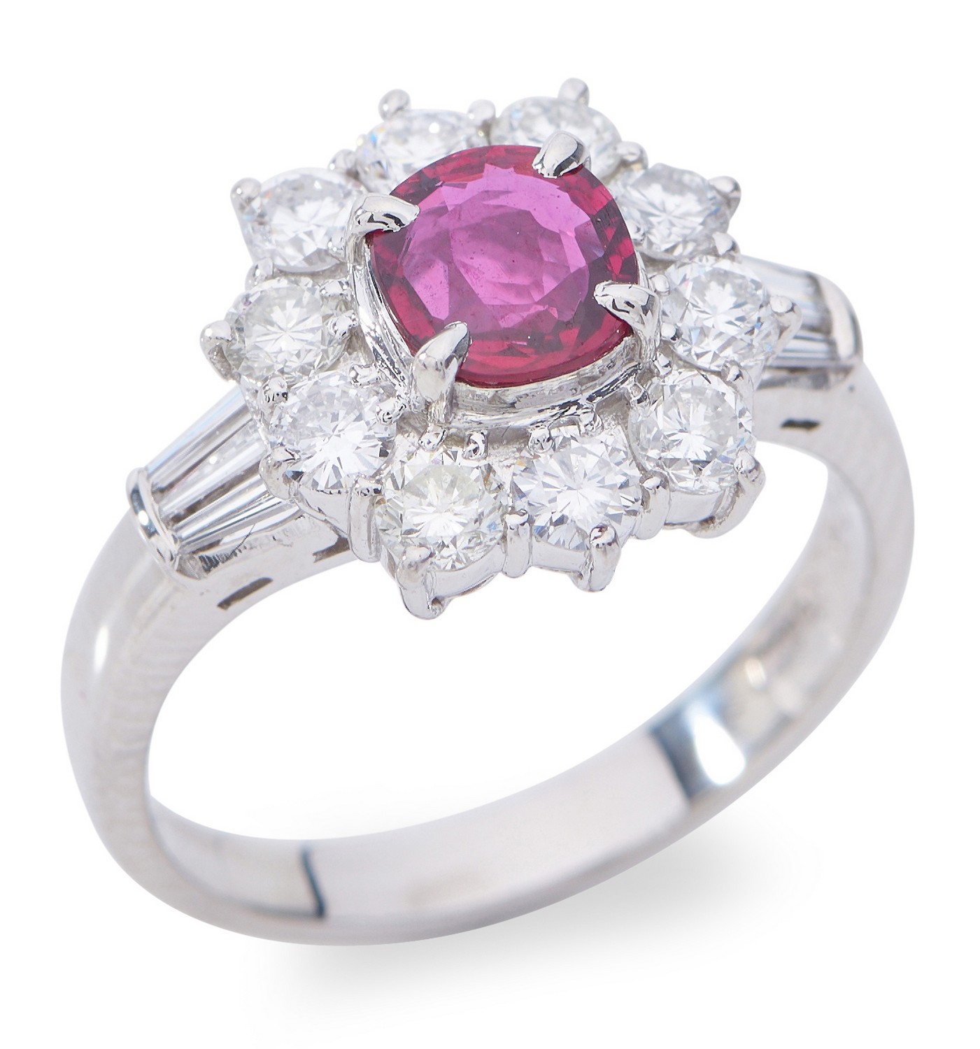 A RUBY AND DIAMOND RING - Of cluster design, featuring a cushion cut ruby weighing an estimated 1.25cts, surrounded by round brilliant cut diamonds and shouldered by tapered baguette cut diamonds, in platinum, ring size L.