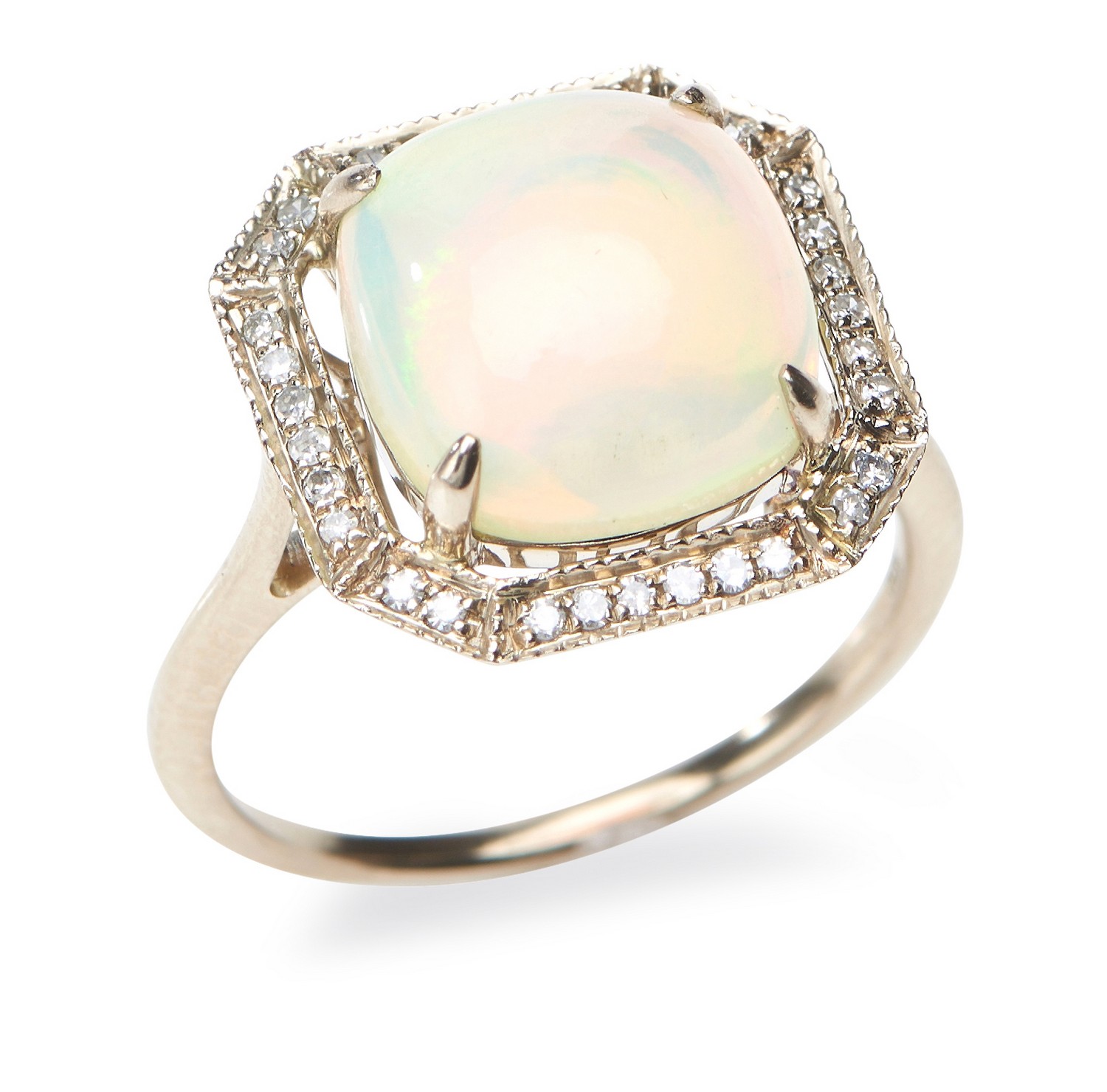 Featuring a cushion shaped opal cut en cabochon, within an octagonal border of single cut diamonds, in 18ct white gold, ring size O.
