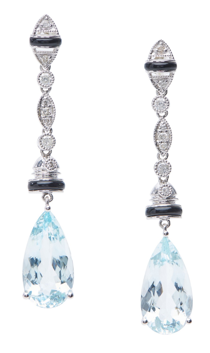 Of Art Deco style, each earring featuring a pear cut aquamarine suspended on an articulated onyx and diamond set drop and stud fitting, in 18ct white gold.
