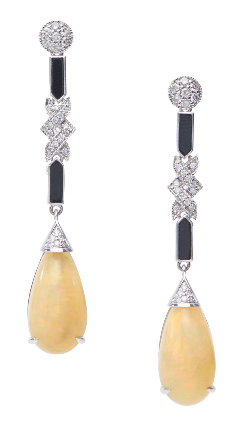 Of Art Deco style, each earring featuring a pear cut opal suspended below an articulated onyx and diamond set drop and stud fitting, in 18ct white gold.