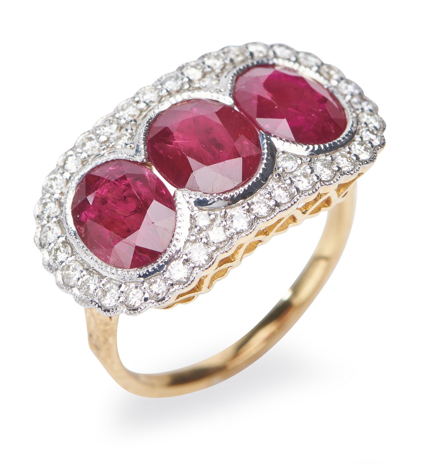 Comprising three oval cut rubies totalling 6.02cts, within a surround of round brilliant cut diamonds totalling 0.47cts, in 18ct gold, ring size M 1/2, with accompanying GSL gemstone report number AA62118/4 stating natural rubies.