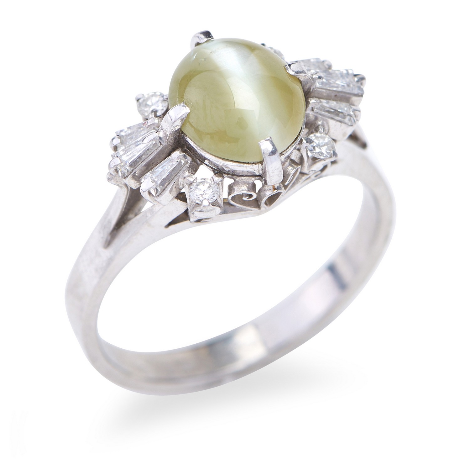 Featuring an oval chrysoberyl displaying chatoyancy, shouldered by round brilliant and tapered baguette cut diamonds, in platinum, ring size O, with accompanying GSL gemstone report number AA62118/1 stating natural cats eye chrysoberyl.