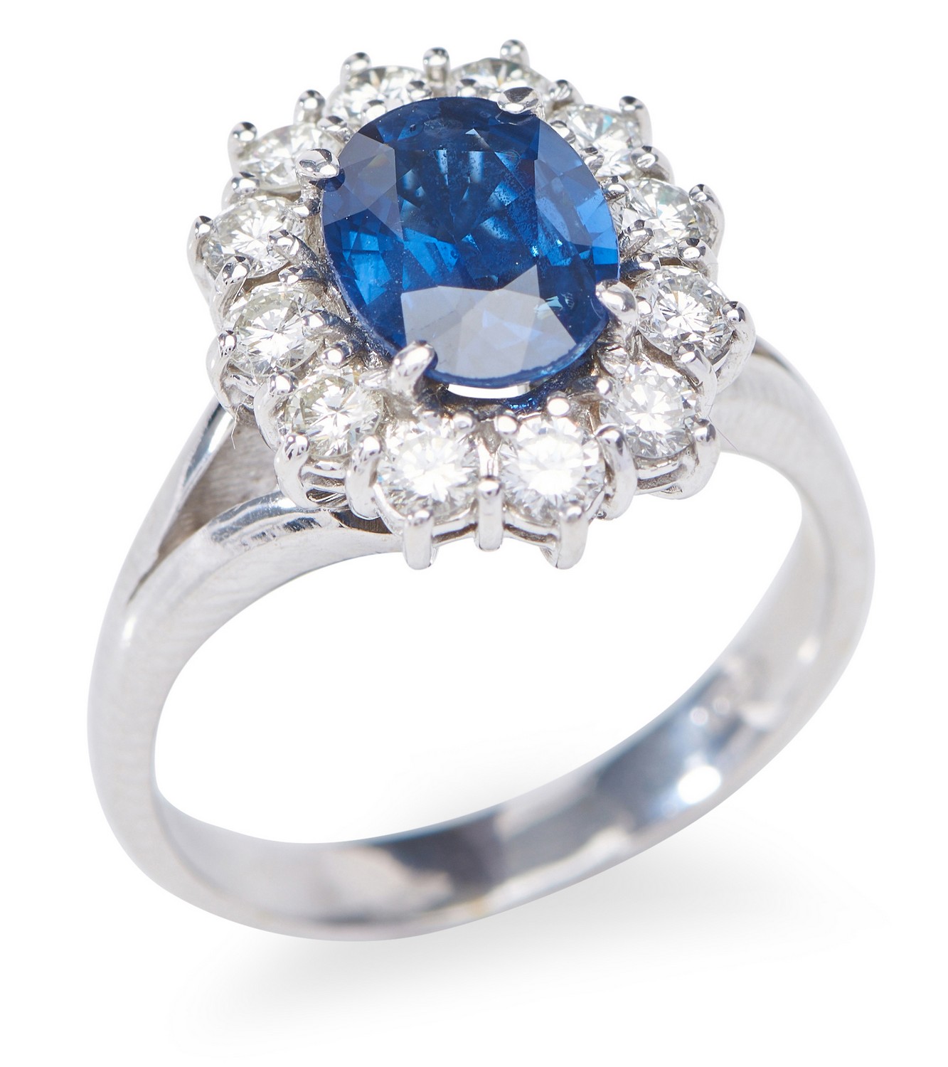 Of cluster design, featuring an oval sapphire weighing 2.25cts, within a border of round brilliant cut diamonds totalling an estimated 0.60cts, in 18ct white gold, ring size O 1/2, with accompanying GSL gemstone report number AA62118/2, stating natural sapphire.