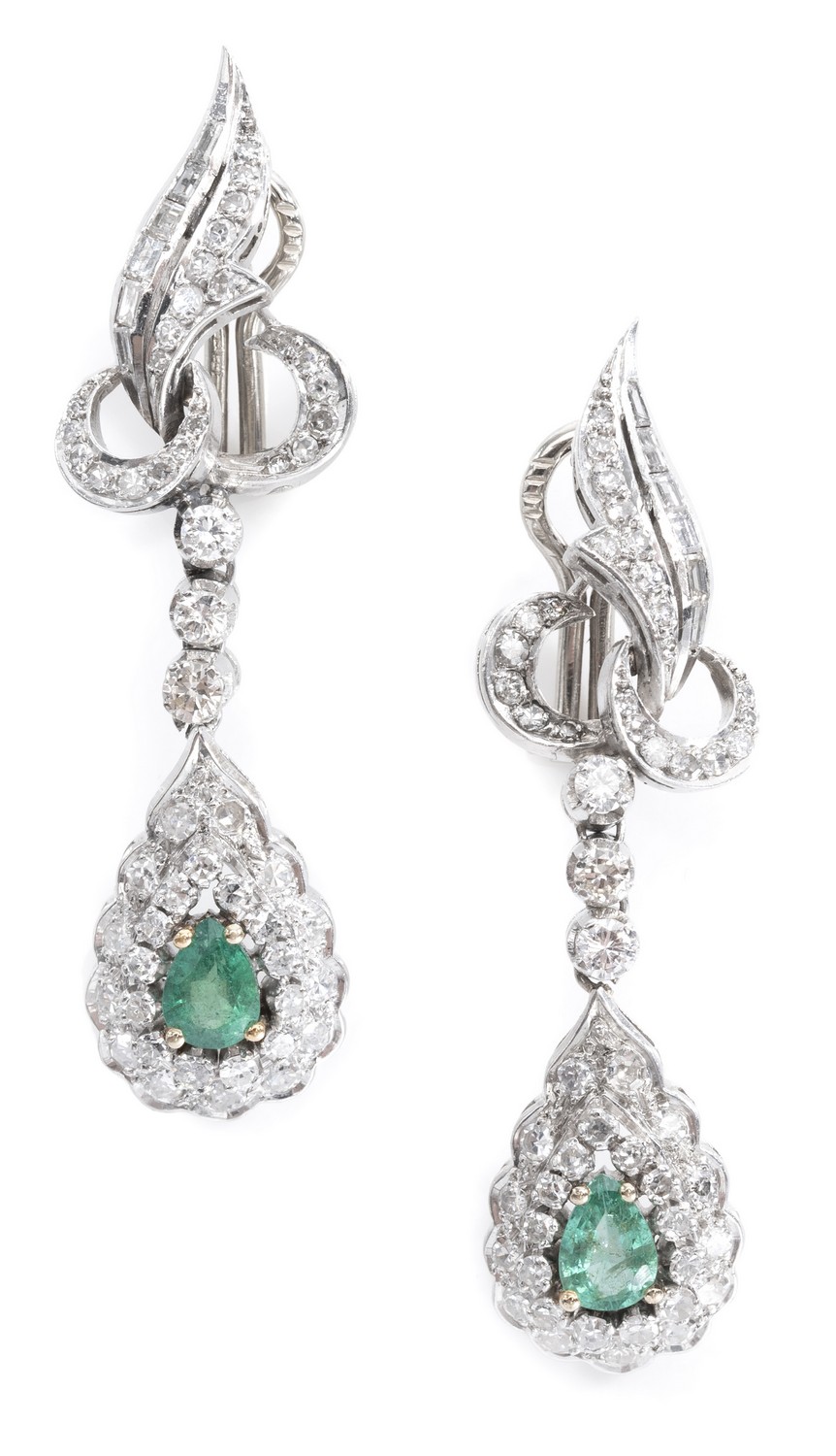 Each earring comprising a pear cut emerald within a double border of single cut diamonds, suspended below a spray design diamond set surmount and articulated drop, to post and clip fittings, in platinum.
