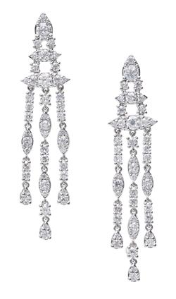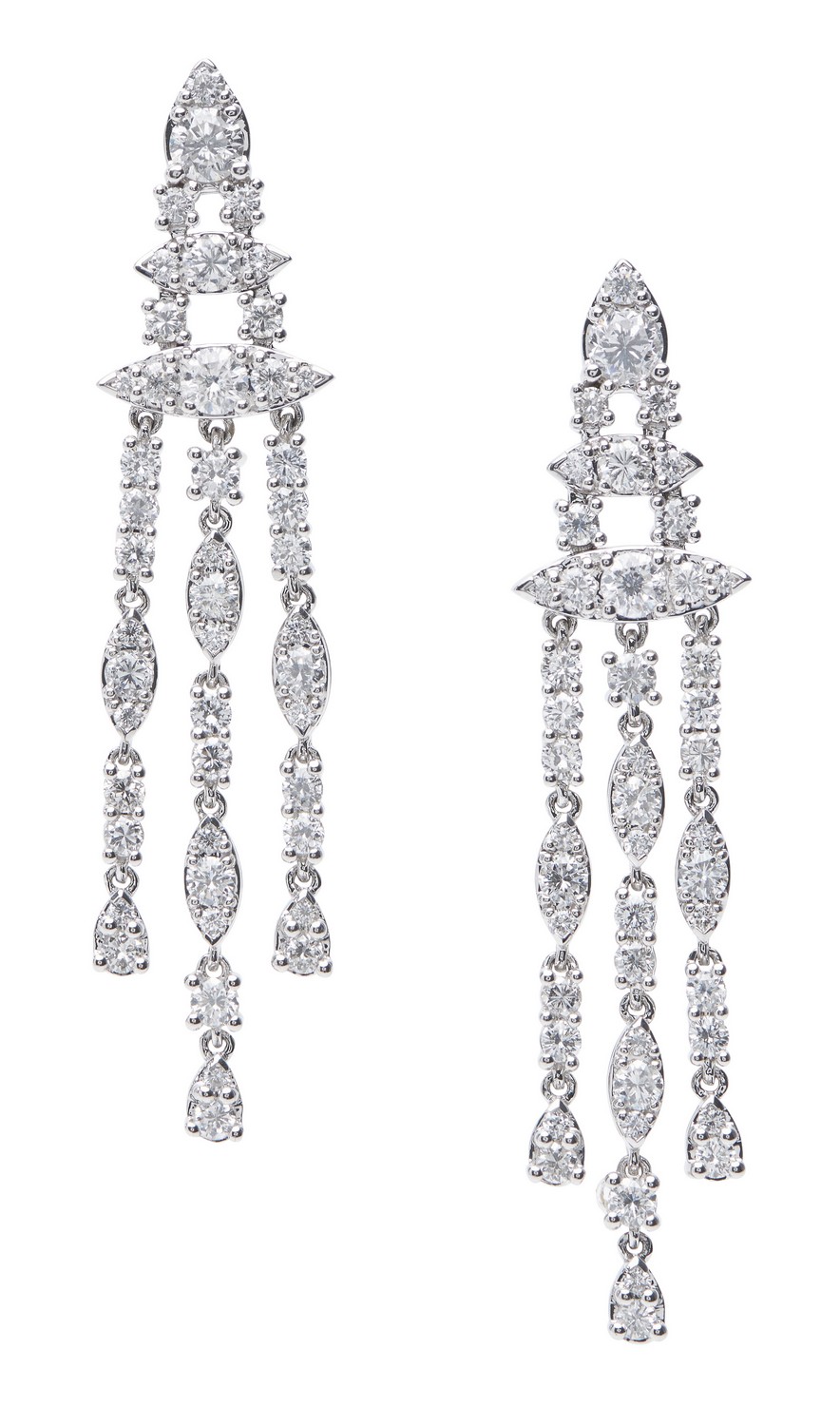 A PAIR OF DIAMOND DROP EARRINGS-Of Art Deco style, each geometric shaped surmount set with round brilliant cut diamonds, suspending three articulated drops, the diamonds totalling 3.96cts, in 18ct white gold.