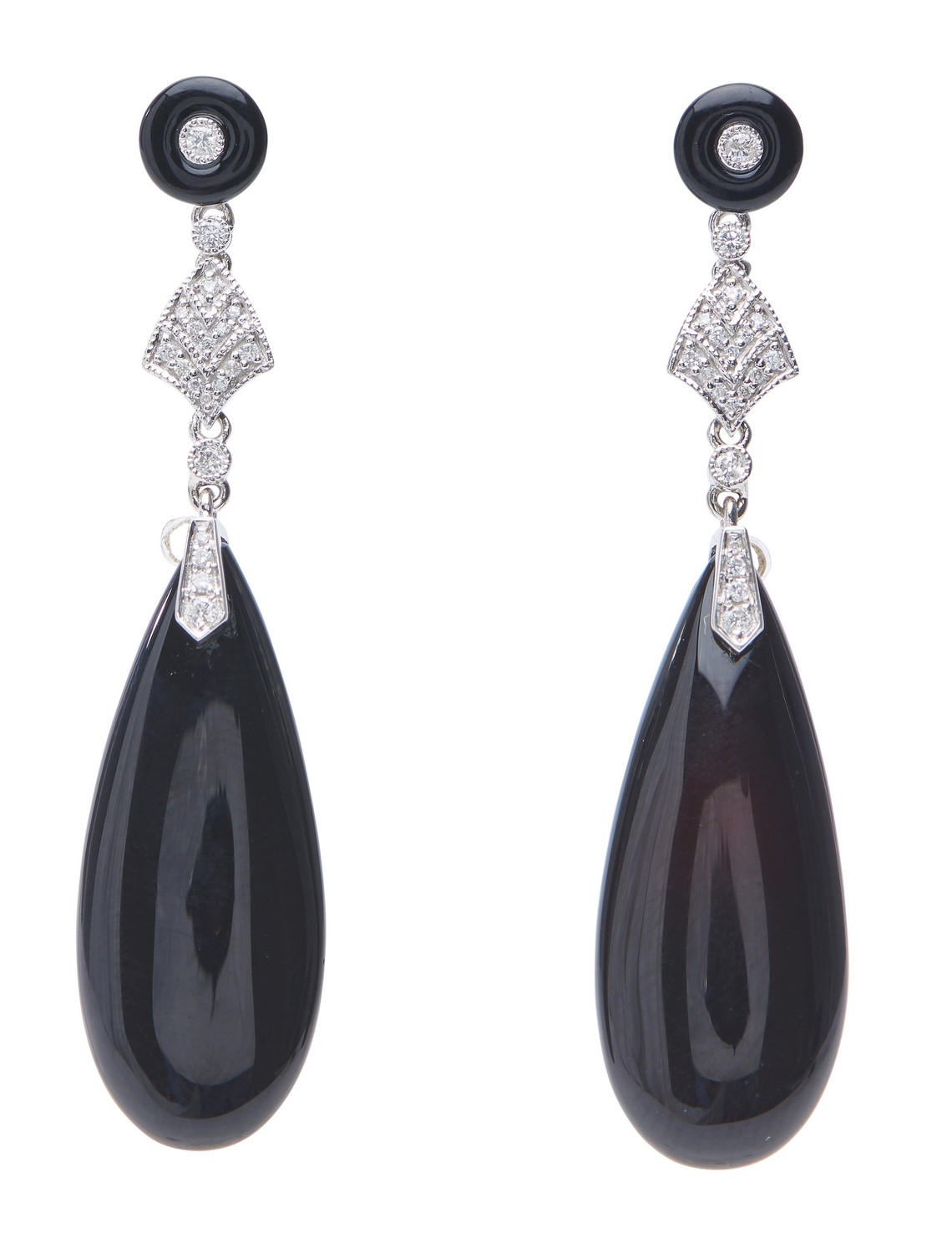 Of Art Deco style, each elongated onyx drop suspended from articulated diamond and onyx fittings, in 18ct white gold.