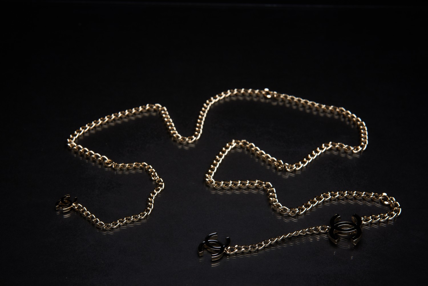 Styled as a gold metal chain with black enamel CC features, adjustable length, boxed.