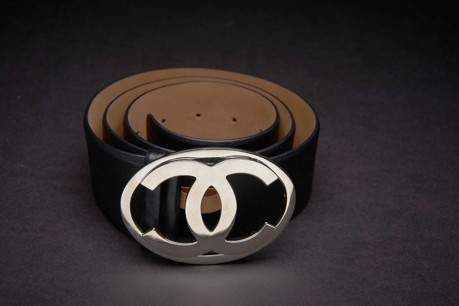Styled in black leather with silver metal CC clasp, stamped 95/38.