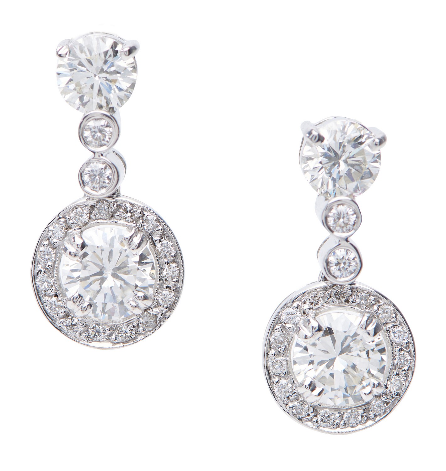 Each earring comprising a diamond cluster, centred with a round brilliant cut diamond weighing 0.82cts, suspended below an articulated diamond set drop and stud fitting, in 18ct white gold.