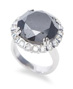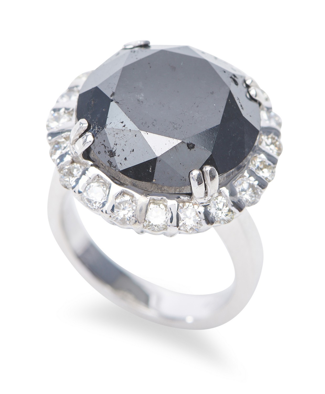 Featuring a round brilliant cut black diamond weighing 18.82cts within a surround of white diamonds totalling 1.68cts, in 18ct white gold, ring size N.