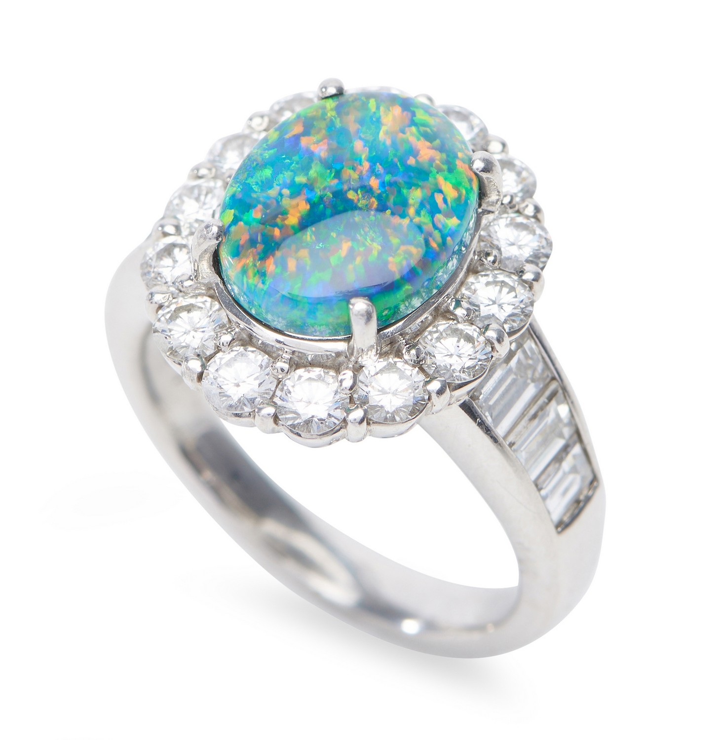 Of cluster design, featuring an oval opal cut en cabochon weighing 2.51cts, surrounded by round brilliant cut diamonds and baguette cut diamond shoulders altogether totalling 1.97cts, in platinum, ring size N.