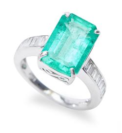 Featuring an emerald cut emerald weighing 4.40cts, claw set within baguette cut diamond set shoulders totalling 0.68cts, in 18ct white gold, ring size L 1/2.