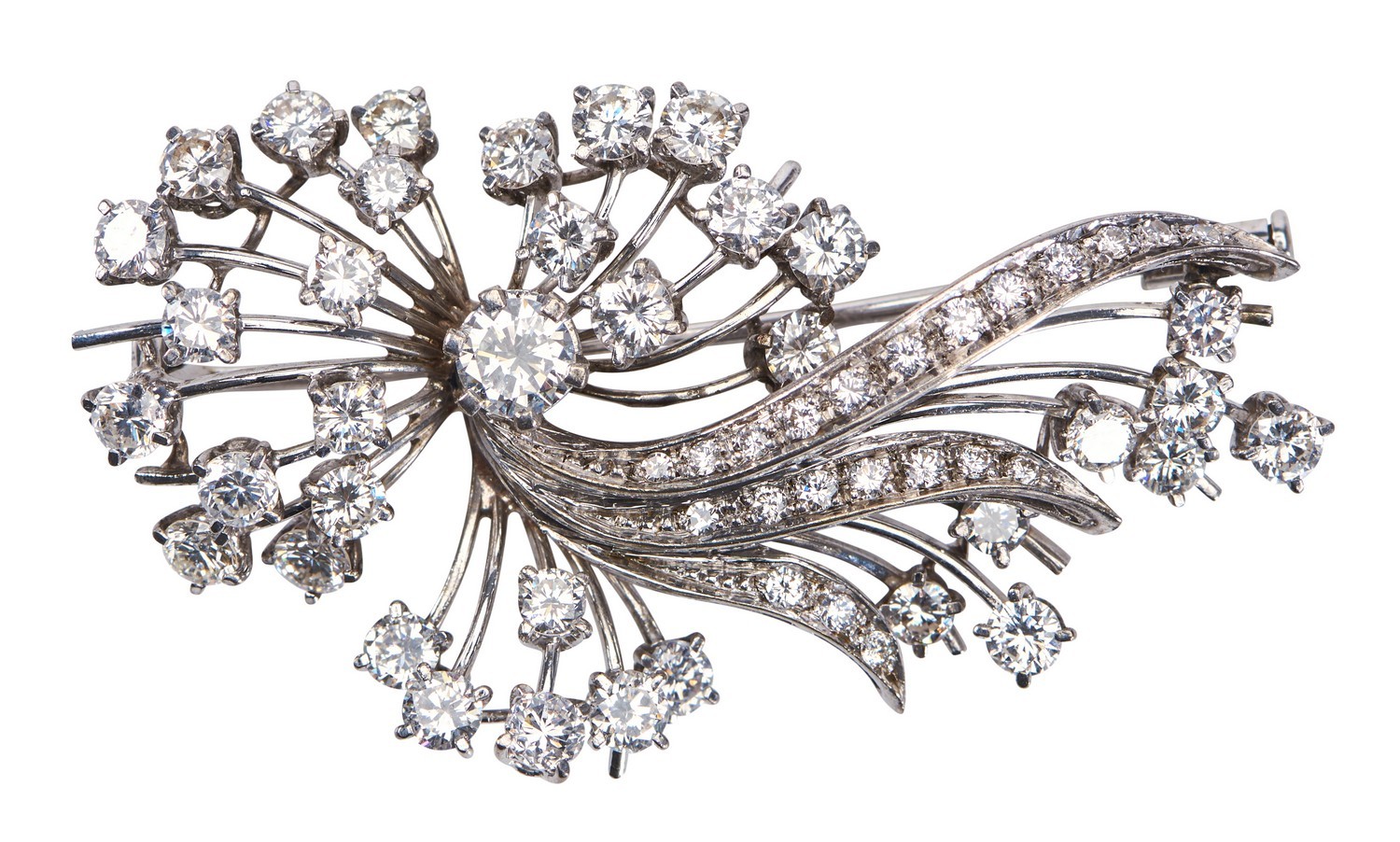 The brooch presents in very good condition. All diamonds are secure. The diamonds are of a good commercial colour with slight variation (estimated F-I) and good clarity (estimated VS-SI). Dimensions 50mm x 30mm. Total weight approximately 15.5 grams.