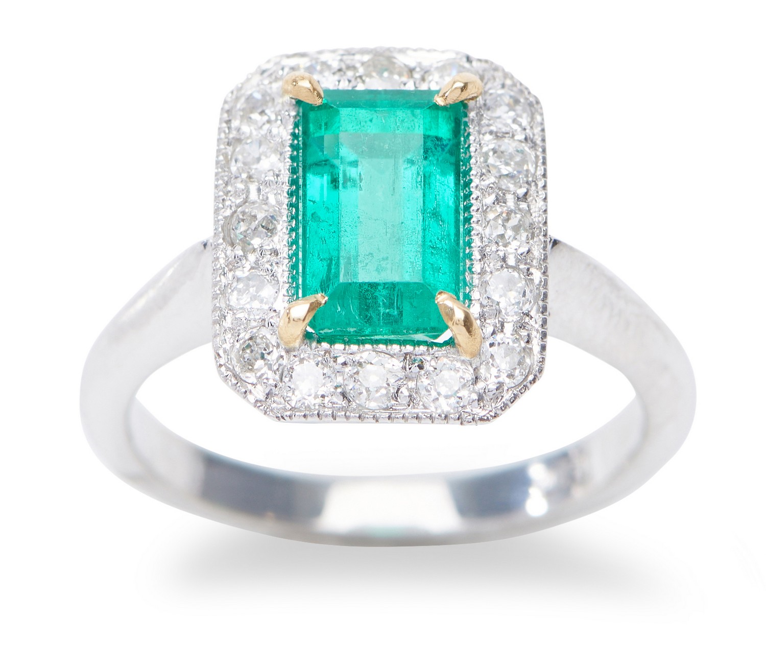 Featuring an emerald cut emerald weighing 1.64cts, within a border of old European cut diamonds totalling 0.40cts, in 18ct white gold, ring size K 1/2.