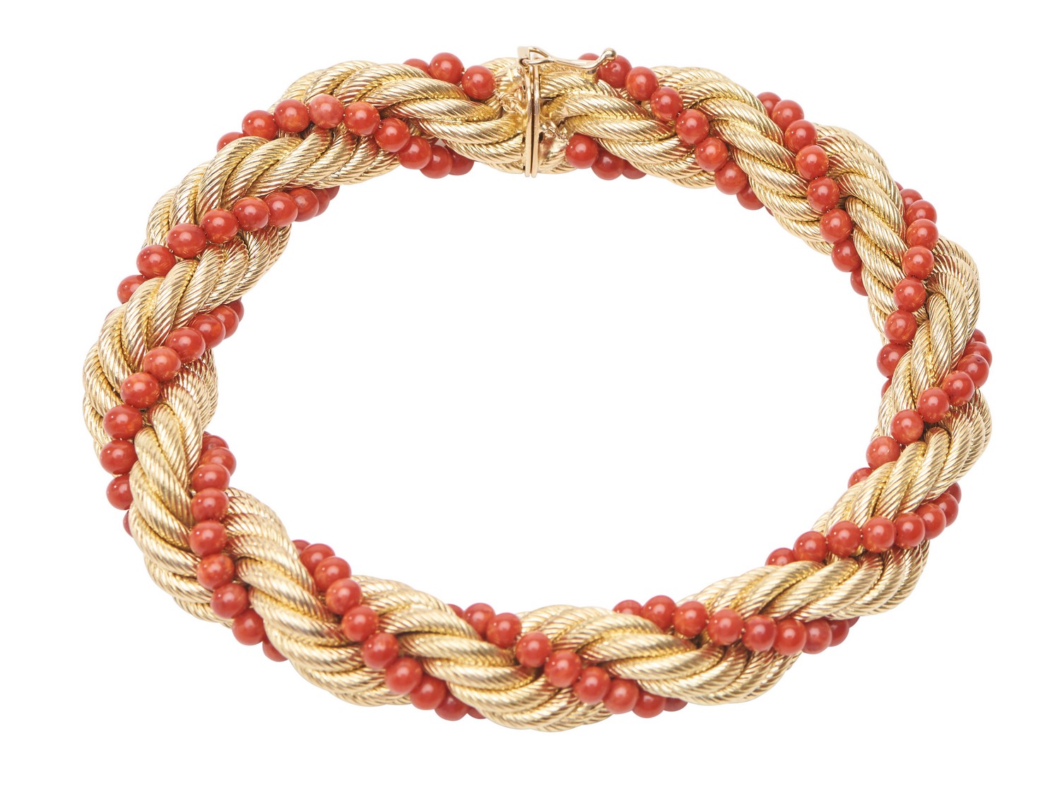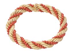 Of twist design, featuring coral beads intertwined with a rope link chain, in 18ct gold, total length 220mm.