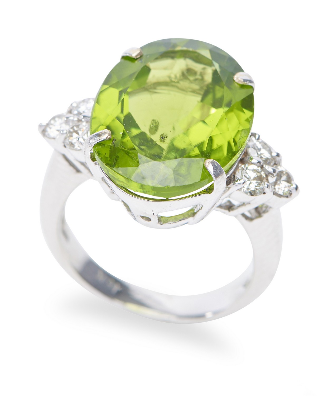 A PERIDOT AND DIAMOND RING-Featuring an oval peridot weighing 12.30cts, flanked by a trefoil of round brilliant cut diamonds totalling 0.68cts, in 18ct white gold, ring size L 1/2.