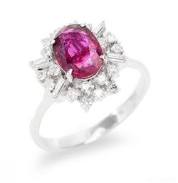 A RUBY AND DIAMOND RING - Of cluster design, featuring an oval ruby weighing 1.34cts, within a border of single and baguette cut diamonds, in 14ct white gold, ring size J 1/2.