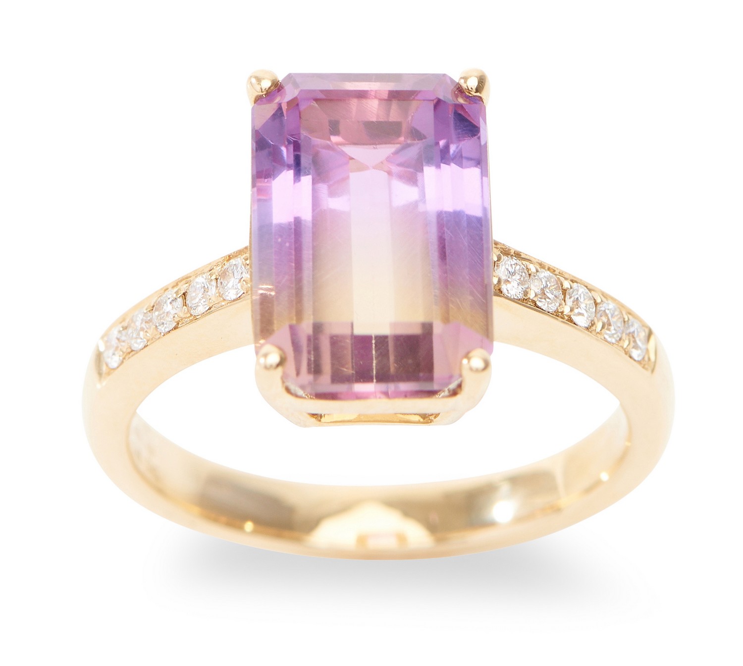 Featuring an emerald cut ametrine weighing 4.49cts, within diamond set shoulders, in 14ct gold, ring size N.