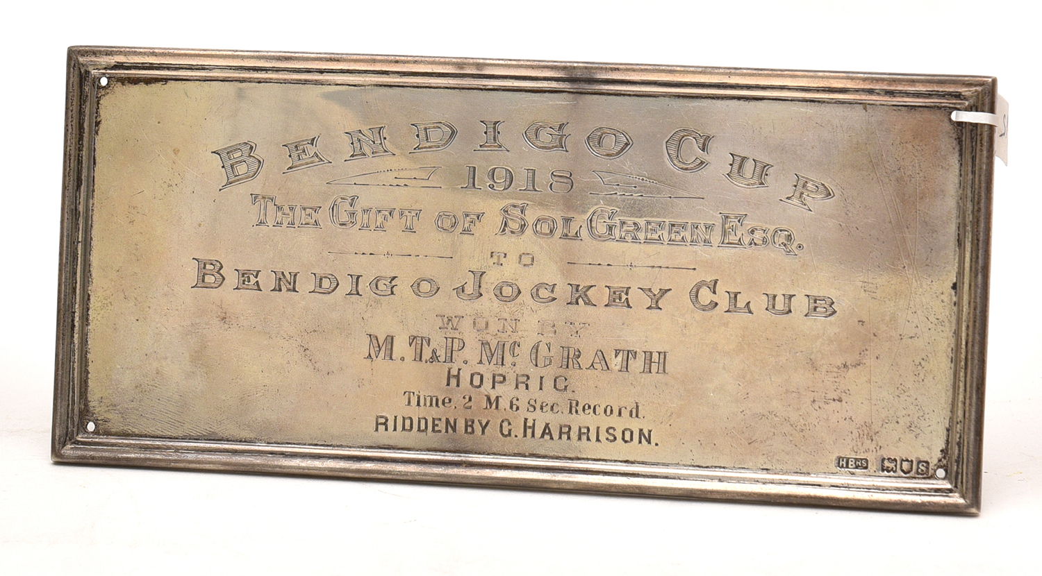 Insribed BENDIGO CUP / 1918 / THE GIFT OF SOLGREEN ESQ. / TO /BENDIGO JOCKEY CLUB / WON BY / M.T & P. McGRATH / HOPRIC / Time, 2 M. 6 Sec. Record / RIDDEN BY G. HARRISON.