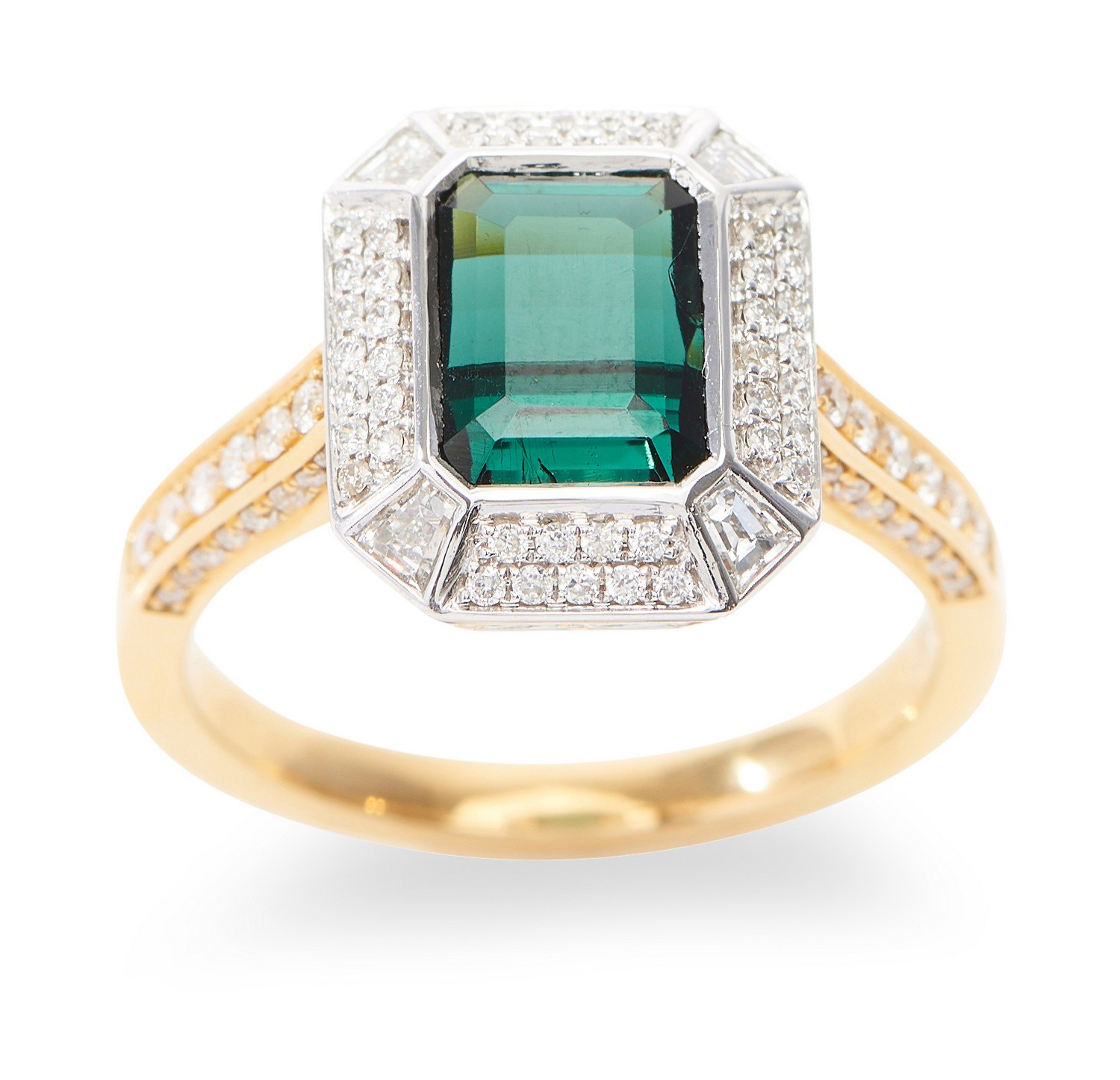 Of Art Deco style, centrally set with an emerald cut green tourmaline weighing 1.87cts, to a diamond set plaque and diamond set shoulders totalling 0.63cts, in 18ct white and yellow gold, ring size N.