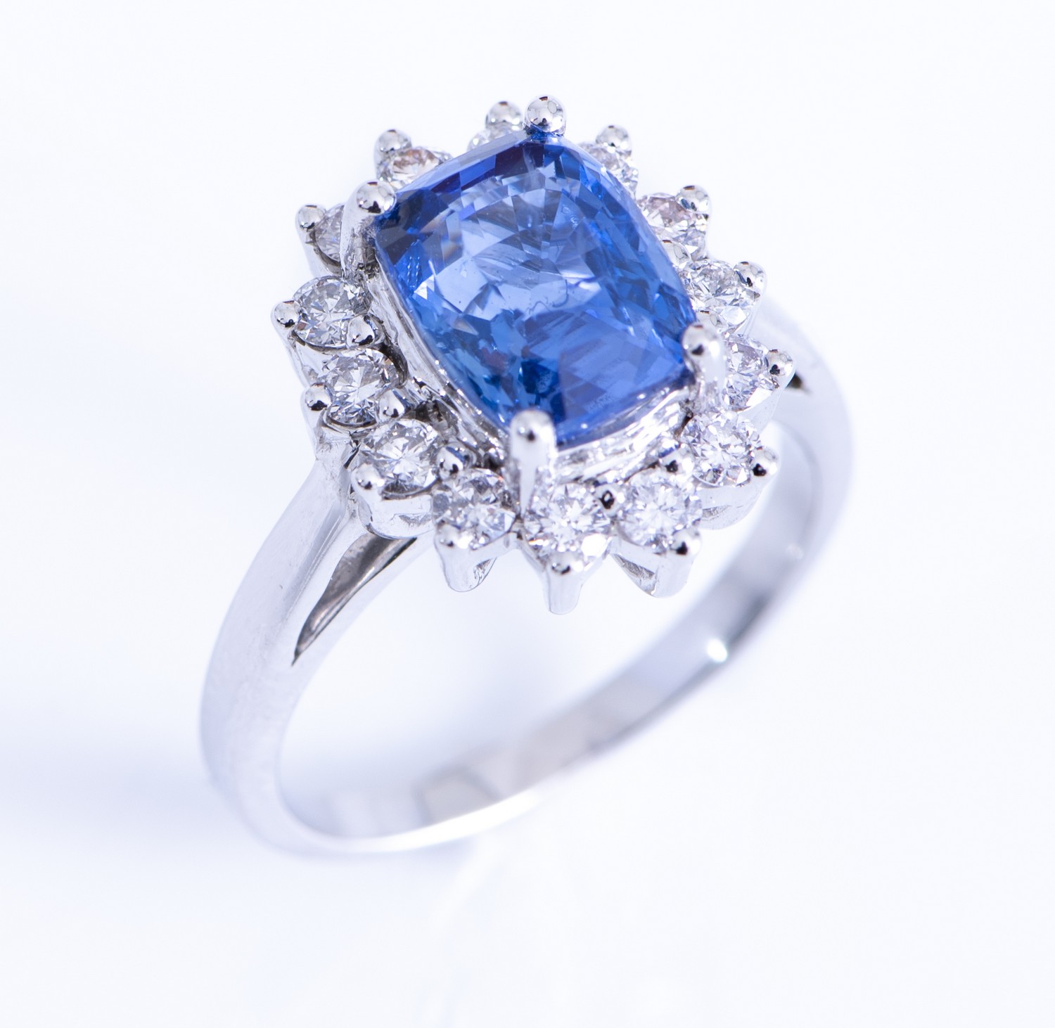The cushion cut sapphire weighing 3.05cts, surrounded by round brilliant cut diamonds totalling 0.60cts, in 14ct white gold, ring size N, with accompanying GSL gemstone report number AA60641/6 stating origin Ceylon.