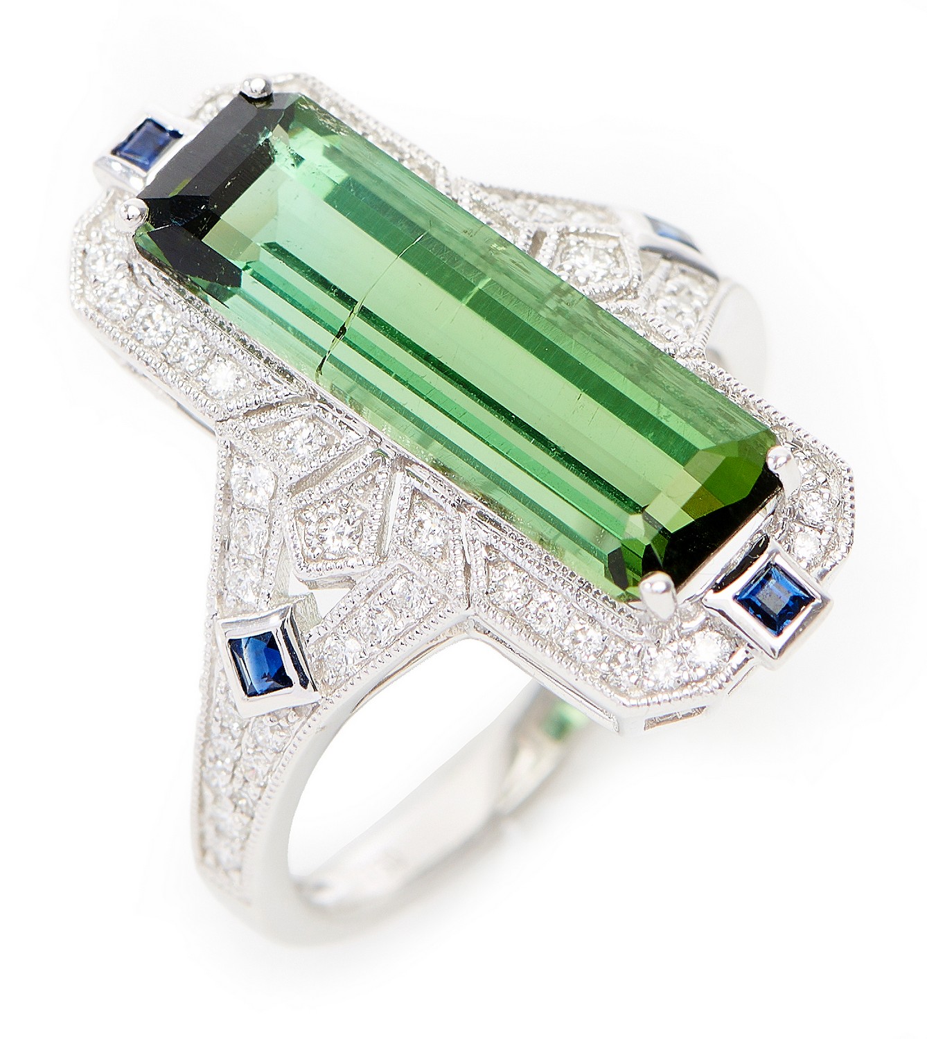 Featuring an elongated emerald cut tourmaline weighing 3.85cts, to a pierced diamond and sapphire surround, in 18ct white gold, ring size N.