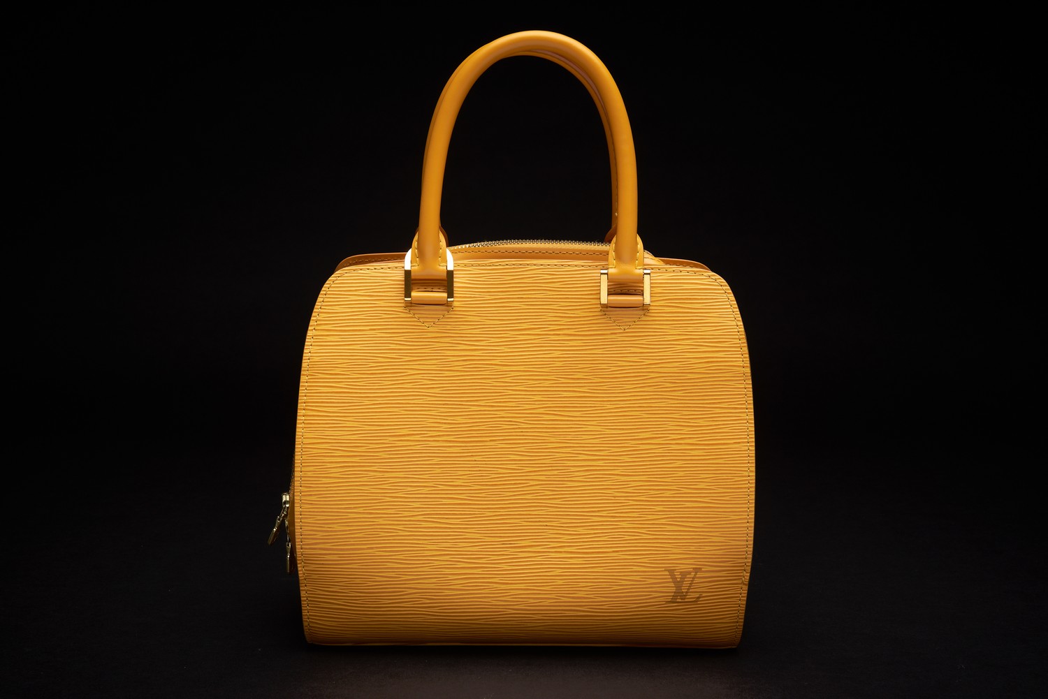 Styled in yellow Epi leather with leather handles and gold metal hardware, 22 x 24 x 8.5cm.