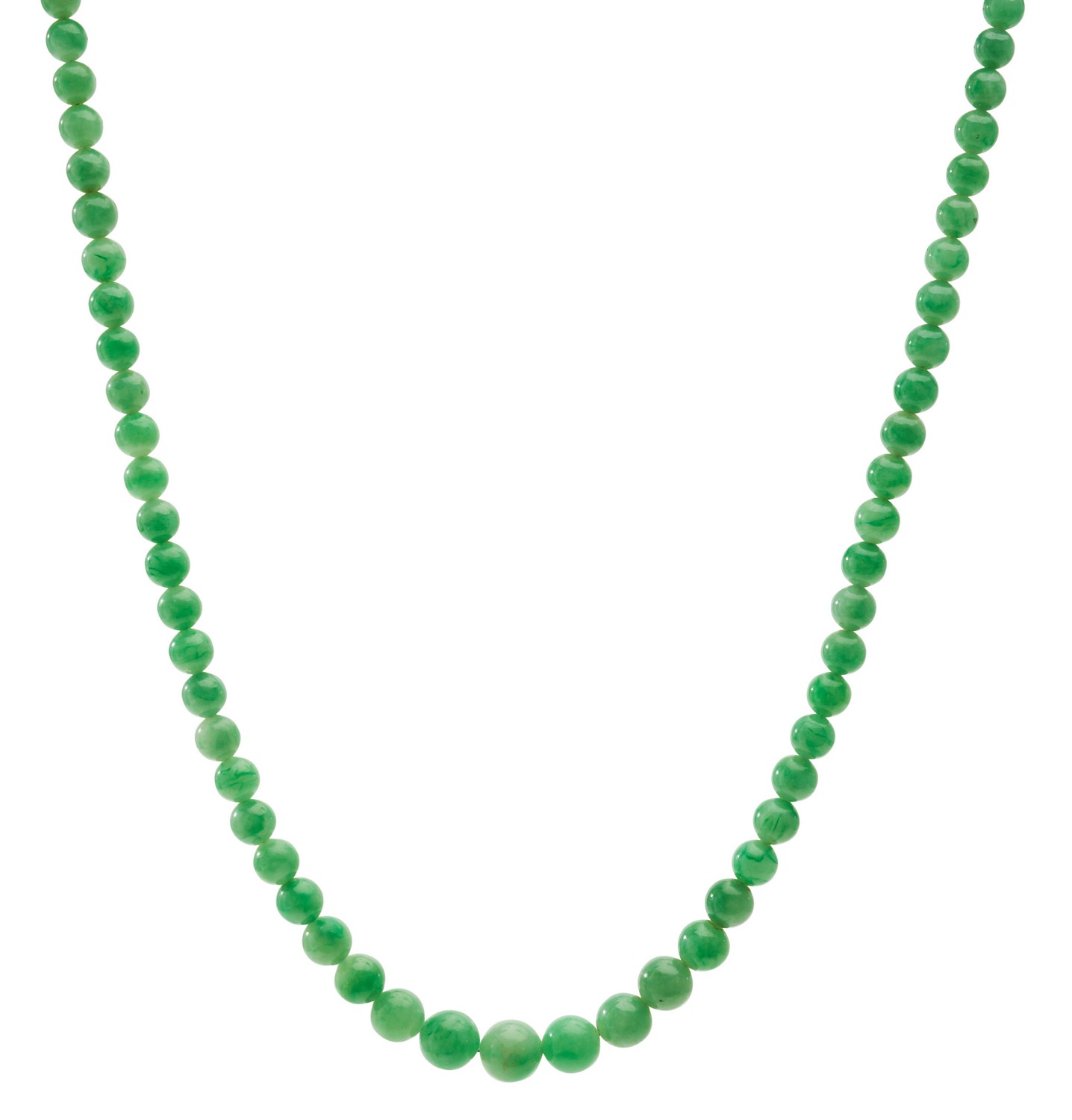 Comprising eighty nine graduating round jadeite beads measuring 4.20mm to 9.60mm, to an oval reeded clasp in 9ct gold, total length 565mm.