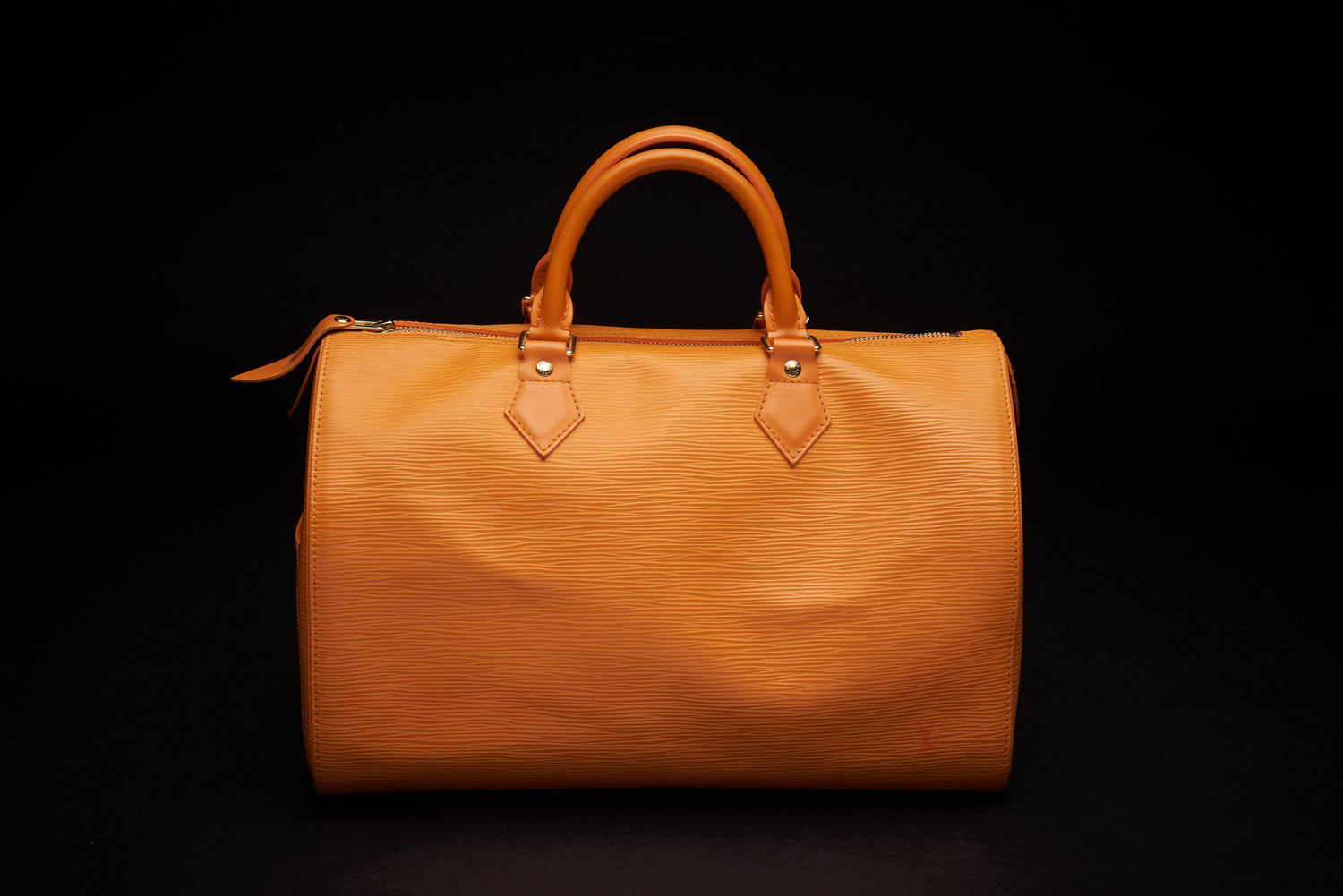 Styled in mandarin Epi leather with leather handles and gold metal hardware, 33 x 22 x 16cm.