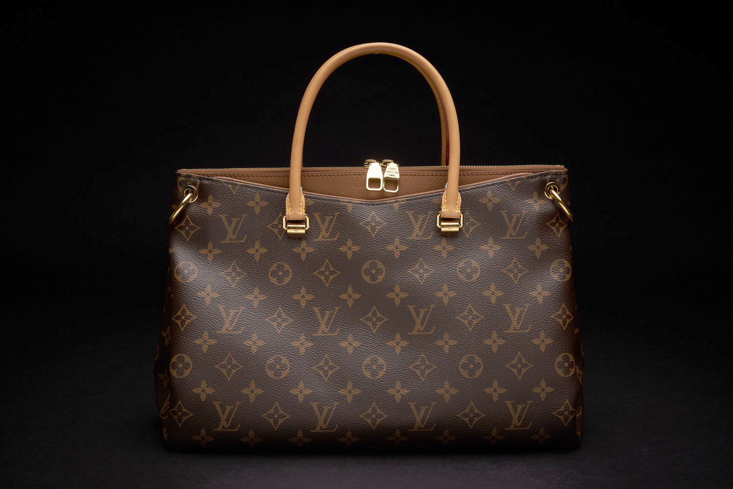 Styled in monogram canvas with tan and brown leather trim and gold metal hardware, with long strap, M41175, 34 x 26 x 13 cm.