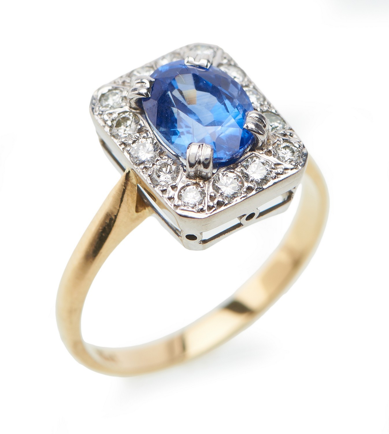 Of rectangular cluster design, featuring an oval cut sapphire weighing an estimated 1.75cts, within a border of round brilliant cut diamonds, in two tone 18ct gold, ring size L.