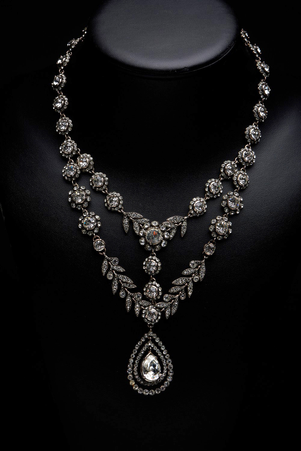 Comprising of a pendant necklace and drop earrings to clip fittings, set with clear stones in silver metal.