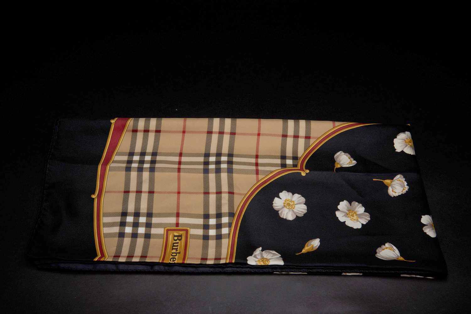 Styled with Burberry tartan and floral design with a black border, 86cm square.