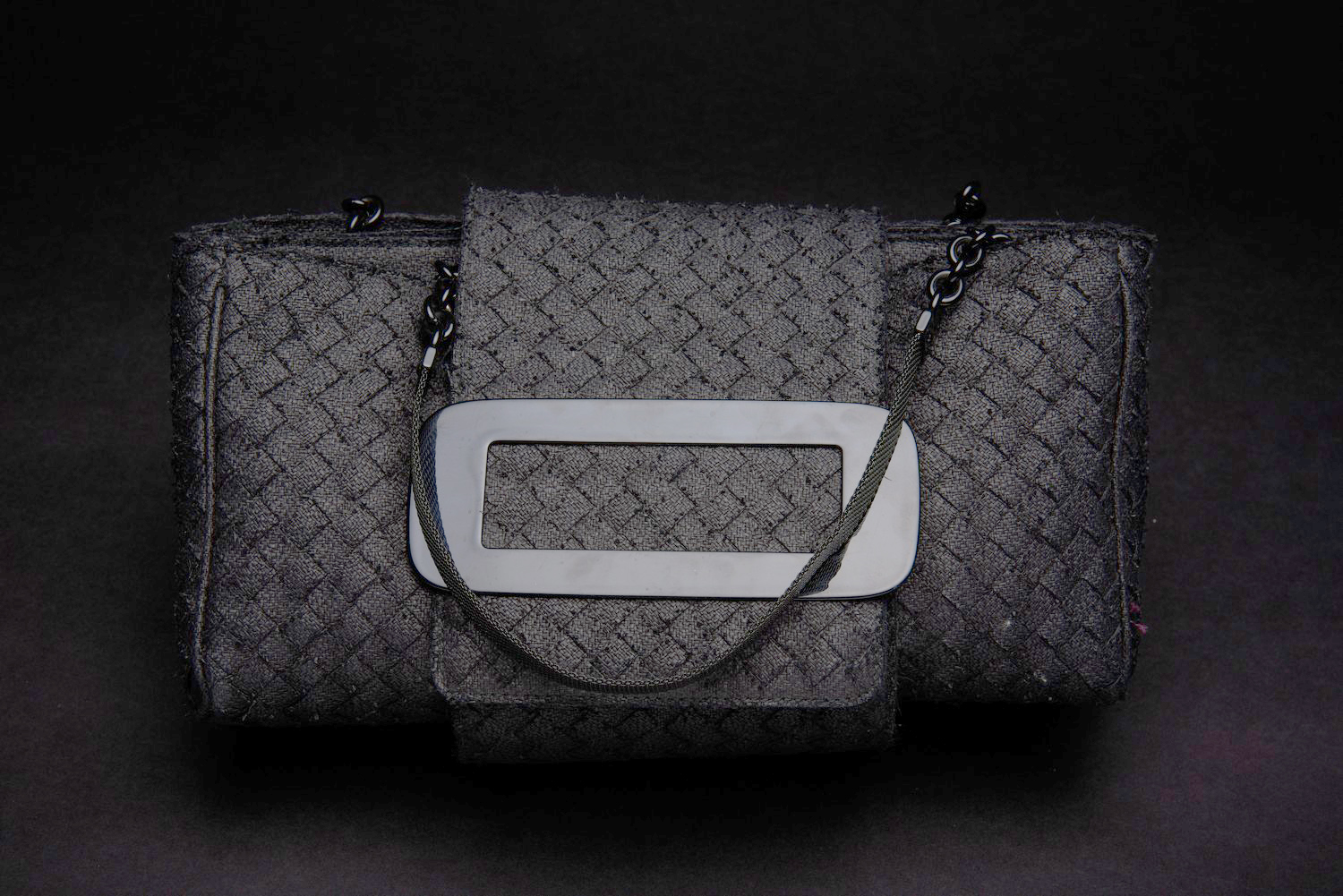 Styled in black Intrecciato woven fabric with black metal hardware and mesh handles, 15 x 28 x 11cm, RRP $2,100.