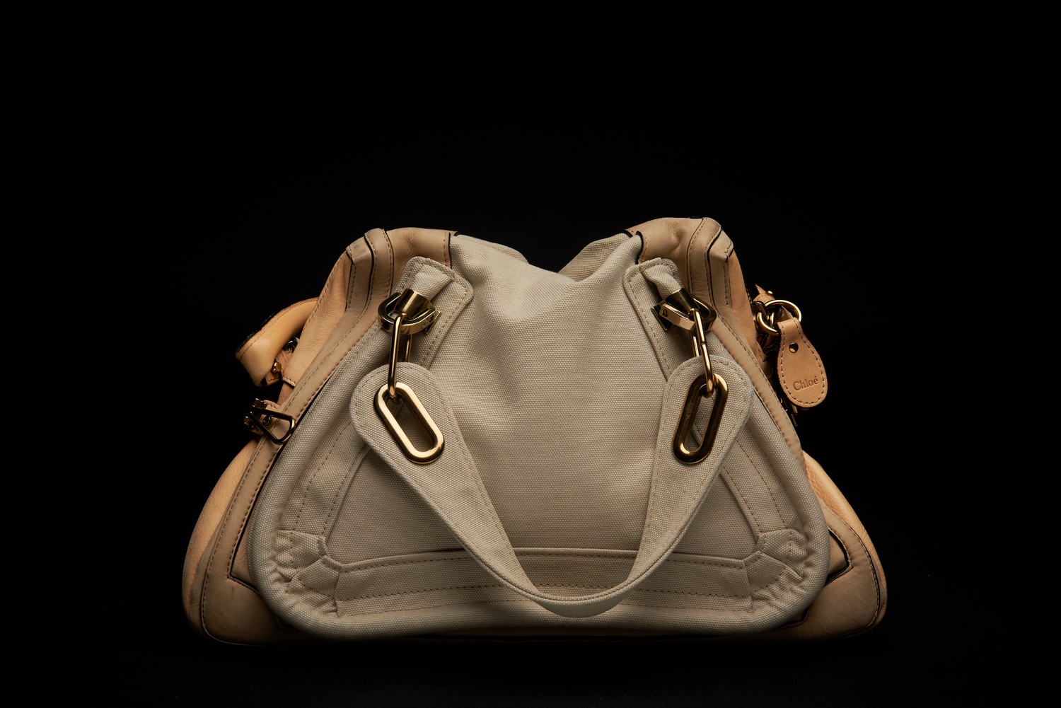Styled in beige leather and canvas with gold metal hardware and long leather strap, 25 x 37 x 17cm.